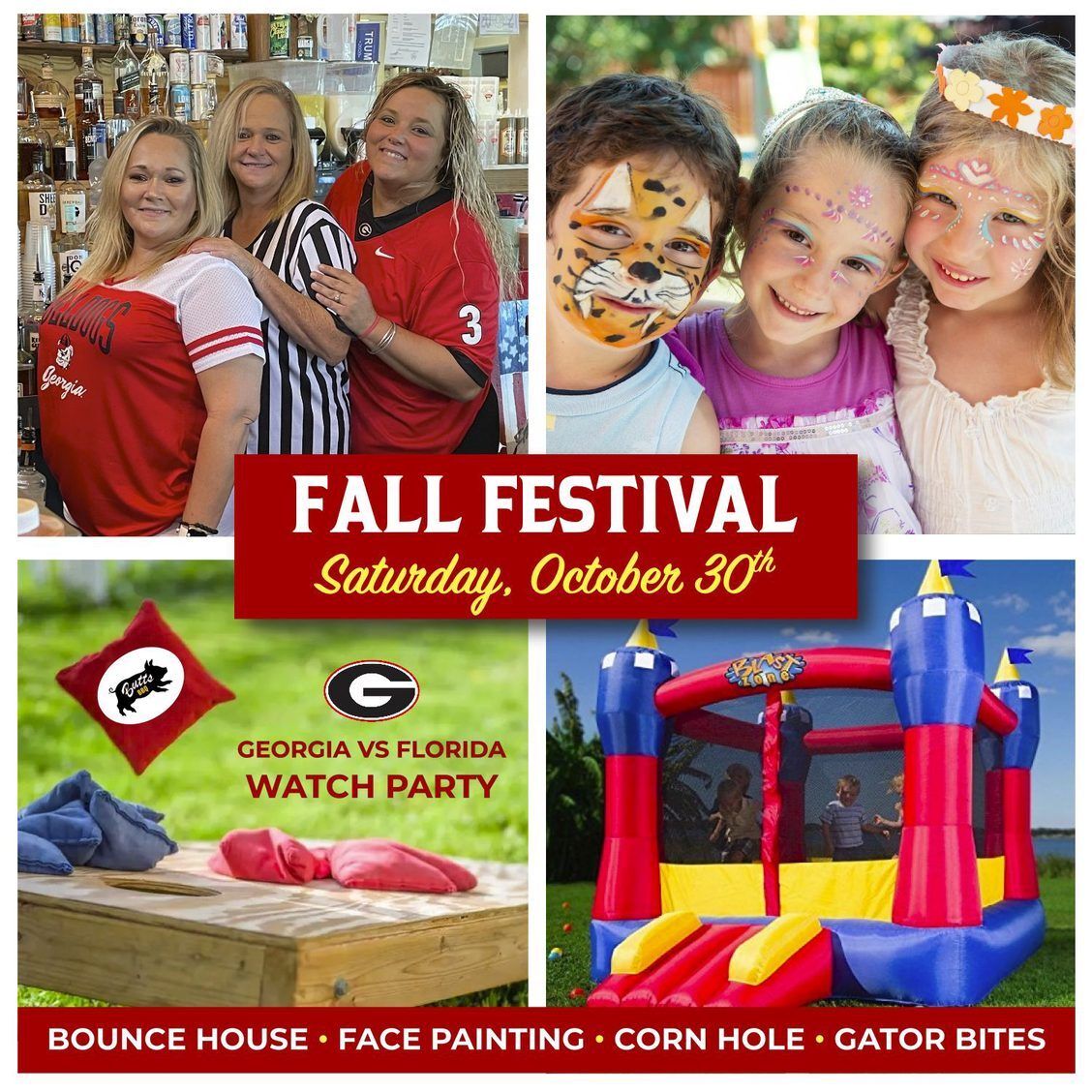It will include a bounce house, face painting, cornhole, costume contest for the kids, and half price gator bites as Georgia plays Florida at 3:30 pm.