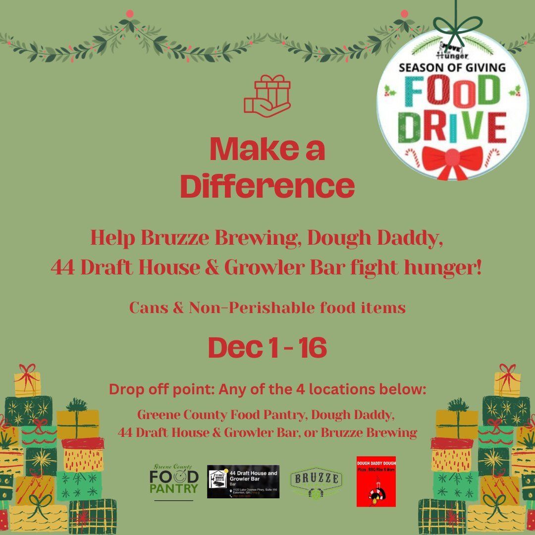Come and be a part of a heartwarming event where Dough Daddy Dough, Bruzze Brewing, 44 Draft House, and the Greene County Food Pantry unite in collecting canned goods. Check the hours and locations below!