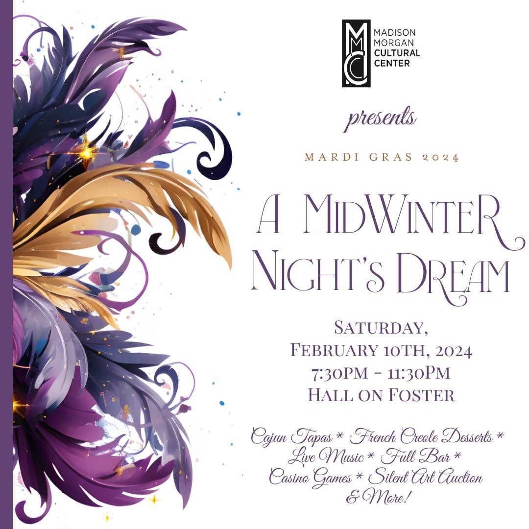 The Madison-Morgan Cultural Center cordially invites you and your friends to attend its Inaugural Mardi Gras Masquerade Ball, A Midwinter’s Night Dream on February 10th, 2024 from 7:30pm - 11:30pm at the Hall on Foster.Enjoy a beautiful evening of Cajun Tapas, French Creole Desserts, Live Music, Full Bar, Casino Games, Silent Art Auction and much more! Come dressed to the nines at this ball gown and black tie affair and remember your most fabulous mask - prizes will be flowing with the champagne!