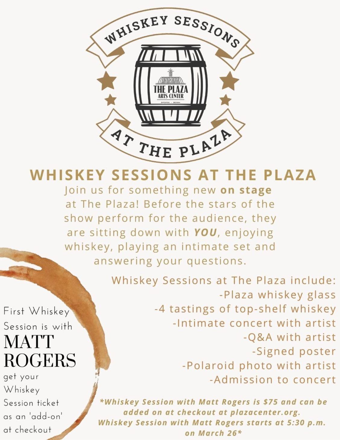 The Plaza is introducing Whiskey Sessions, which will take place BEFORE the concert to allow for a special VIP experience with the artists. Not every concert will have a Whiskey Session attached, but for those that do, it will be something special!