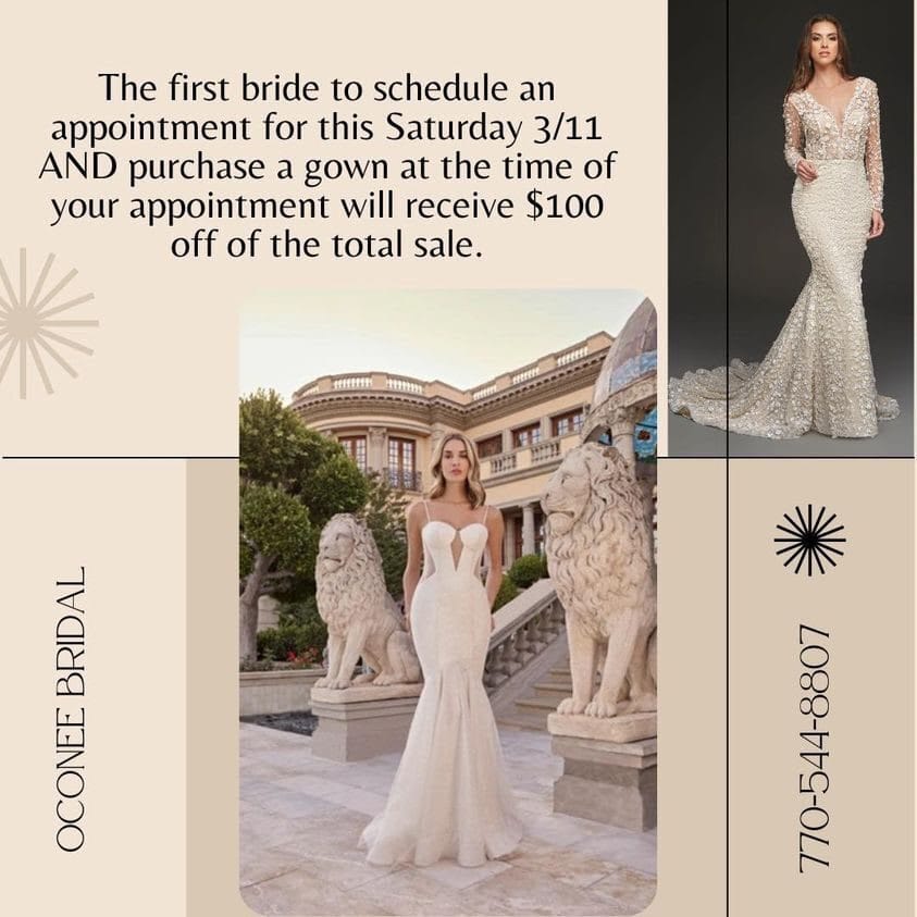 From our friends at Oconee Bridal: the first bride to schedule an appointment for this Saturday, March 11th AND purchase a gown during your appointment will receive a $100 discount on the total sale. 💰