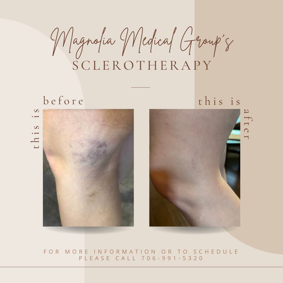 Magnolia Medical Group is now offering Sclerotherapy!What is Sclerotherapy and how can it benefit you?According to Magnolia Medical Group, Sclerotherapy is a treatment they use to eliminate varicose veins and the appearance of spider veins. Although the procedure was originally mostly used to address cosmetic issues with varicose or spider veins, this is no longer true. Sclerotherapy is also used to treat the underlying pathology that causes the unsightly visible veins in the first place. This underlying pathology can cause pain and discomfort, and thankfully, sclerotherapy can relieve the discomfort that accompanies that underlying condition.Veins that respond well to treatment don’t reappear. You might need more than one treatment to achieve your desired results.For more information or to schedule an appointment, please call Magnolia Medical Group at 706-991-5320.