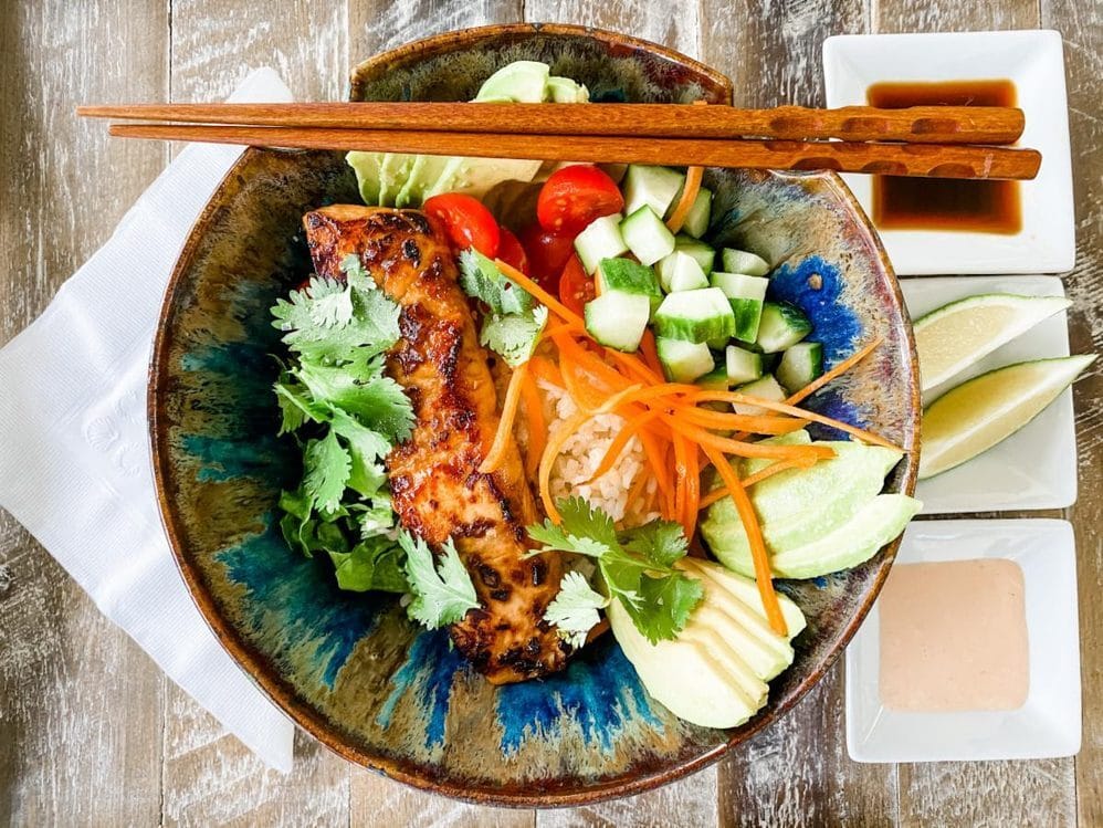 Each group chooses either Salmon Poke Bowl or Chicken Paillards with Asparagus.