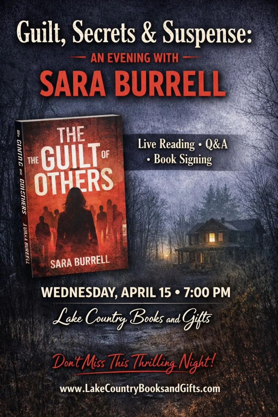 Expect a live reading, a peek behind the story, and an open Q&A. The Guilt of Others is psychological suspense done right, the kind of book that keeps you up past your bedtime, then makes you a little suspicious of everyone at the breakfast table.